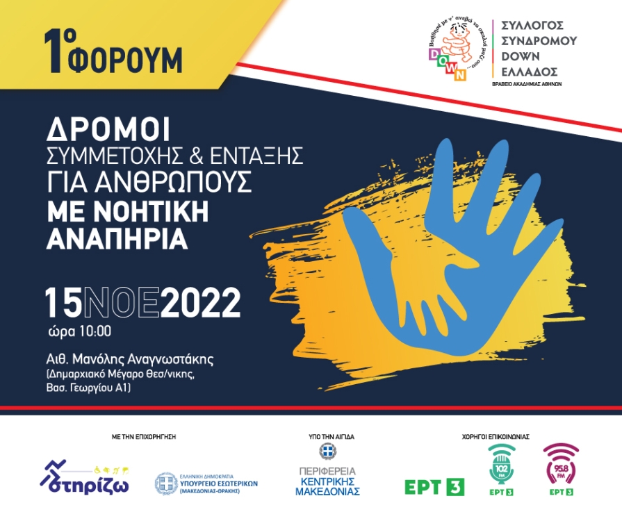 O Σύλλογος Συνδρόμου Down Ελλάδας σας προσκαλεί στο 1ο Φόρουμ με θέμα: "Δρόμοι Συμμετοχής και Ένταξης των Ανθρώπων με Νοητική Αναπηρία" την Τρίτη 15 Νοεμβρίου 2022 και ώρα 10:00 στην αιθ. Μανόλης Αναγνωστάκης, στη Θεσσαλονίκη.