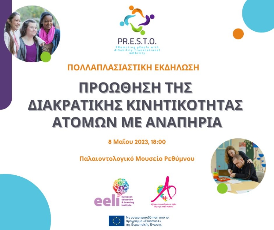 Το PRESTO project έχει ως κύριο στόχο τη συμπερίληψη ατόμων με νοητικές αναπηρίες σε κινητικότητες επαγγελματικής εκπαίδευσης στην Ευρώπη (ΚΑ1 Erasmus+) , με σκοπό την απόκτηση δεξιοτήτων, χρήσιμων για τη μελλοντική τους επαγγελματική αποκατάσταση και την ανεξαρτησία τους.