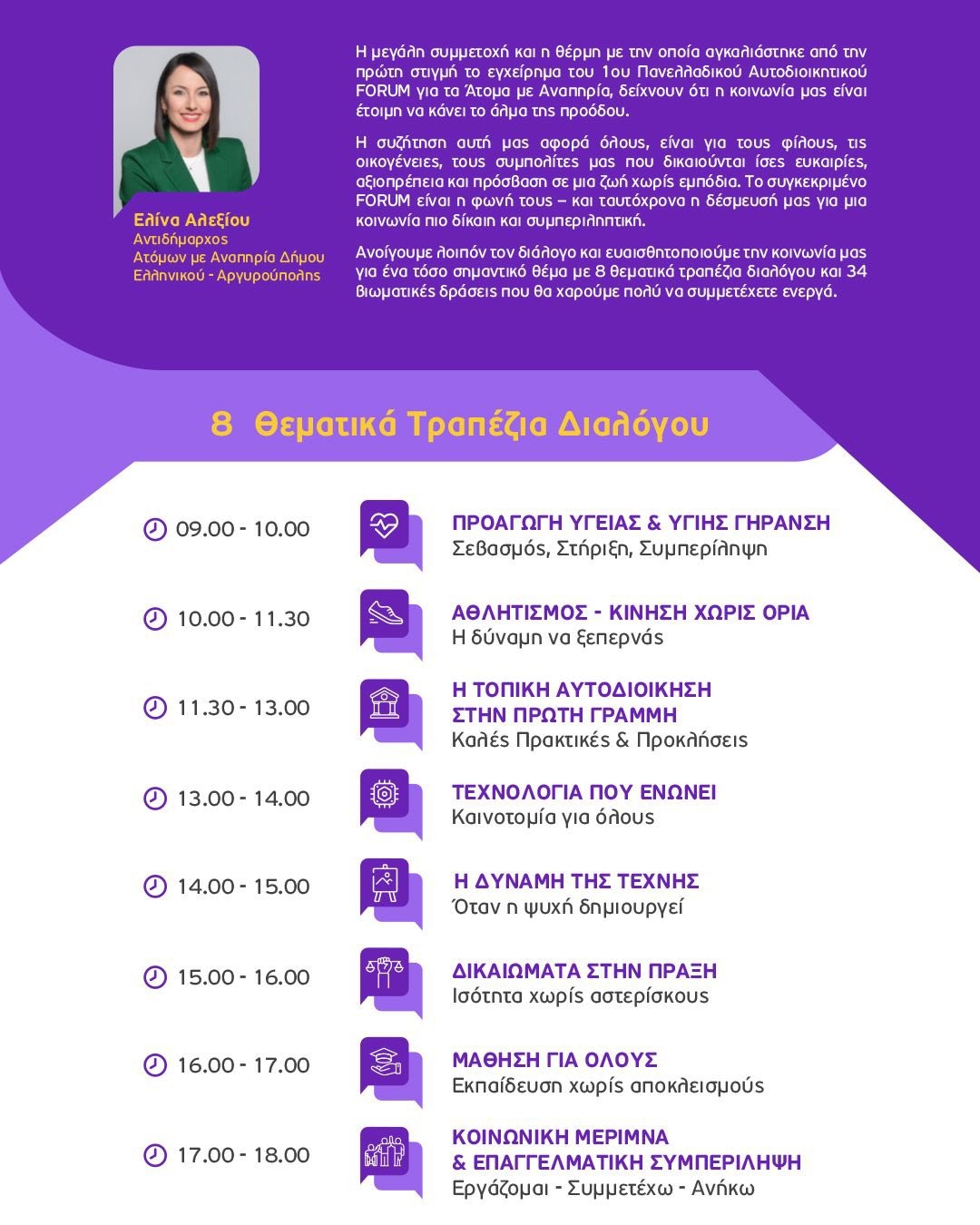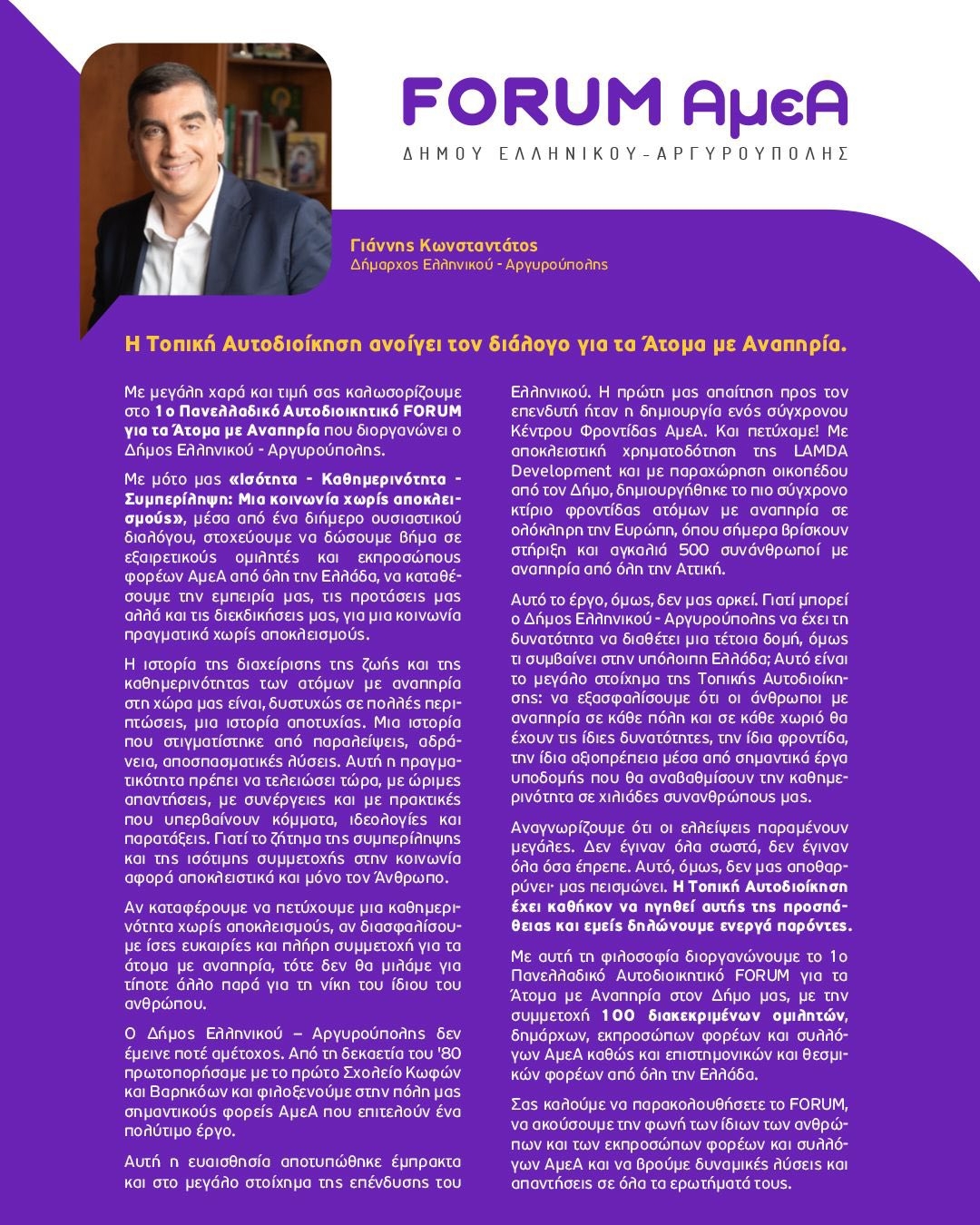 «Η Τοπική Αυτοδιοίκηση ανοίγει τον διάλογο για τα Άτομα με Αναπηρία και μέσα από το FORUM κεντρικός στόχος είναι να παρουσιαστούν καλές πρακτικές, που έχουν ήδη εφαρμοστεί στην Ελλάδα και το εξωτερικό, αλλά και να αναδειχθούν τα προβλήματα, τα κενά και οι ανάγκες που παραμένουν, ώστε να διαμορφωθεί μια κοινή βάση προτάσεων και δράσεων προς όφελος των ατόμων με αναπηρία. Η ιστορία της διαχείρισης της ζωής και της καθημερινότητας των ατόμων με αναπηρία στη χώρα μας, είναι μια ιστορία αποτυχίας και αυτό πρέπει κάποια στιγμή να τελειώσει με ώριμες απαντήσεις και λύσεις. Οι πρακτικές, που πρέπει να ακολουθηθούν είναι πάνω από ιδεολογίες, κόμματα και παρατάξεις και αφορούν αποκλειστικά και μόνον τον άνθρωπο. Αν τα καταφέρουμε, αν πετύχουμε μια ισότιμη καθημερινότητα, συμπερίληψη και ίσες ευκαιρίες για τους ανθρώπους με αναπηρία, τότε πλέον δεν θα μιλάμε για τίποτε άλλο παρά για την επιτυχία του ανθρώπου».