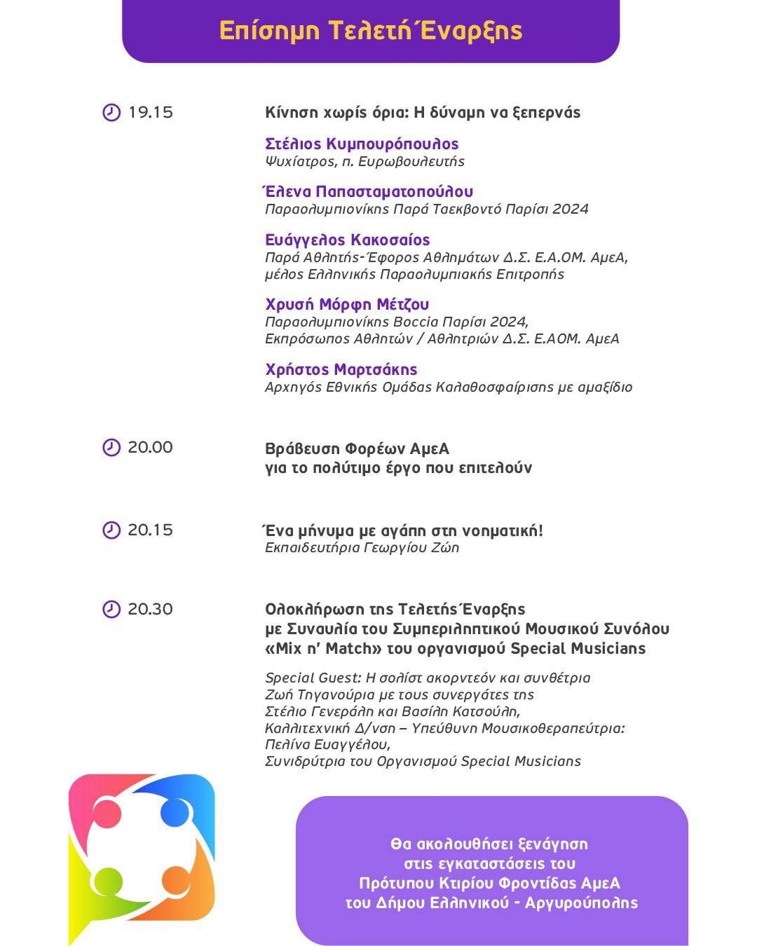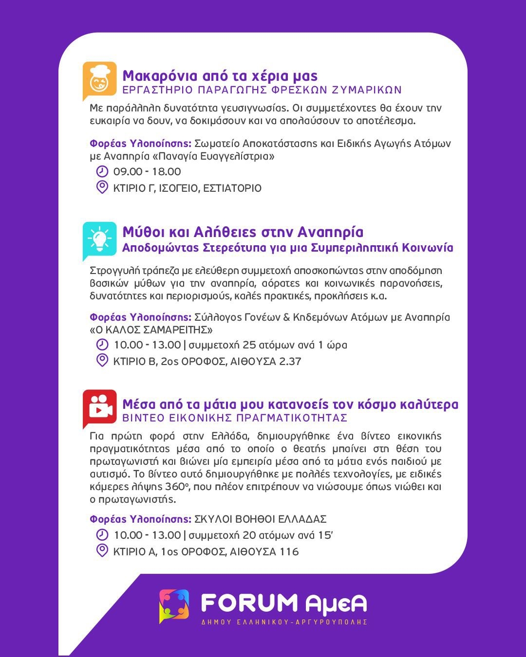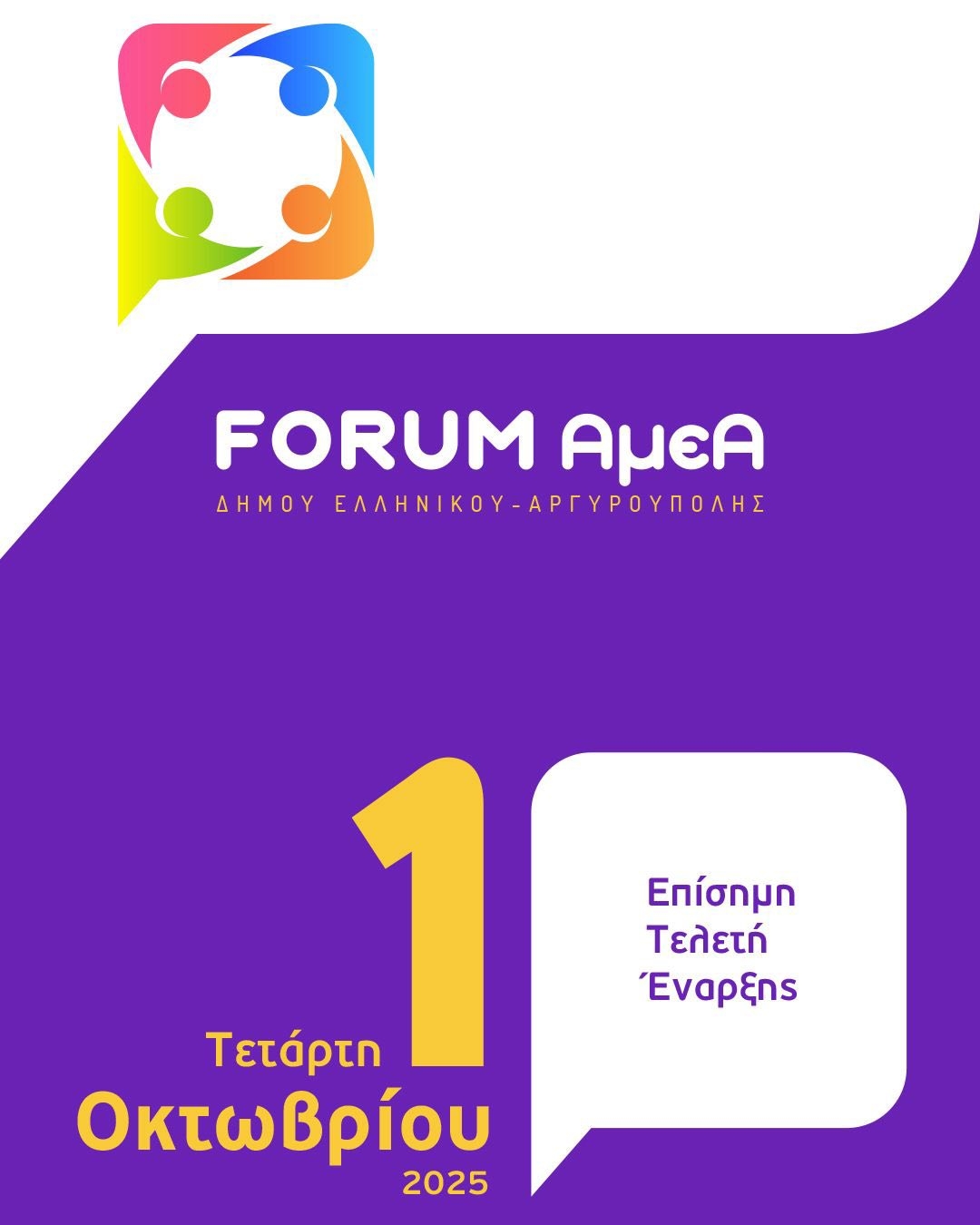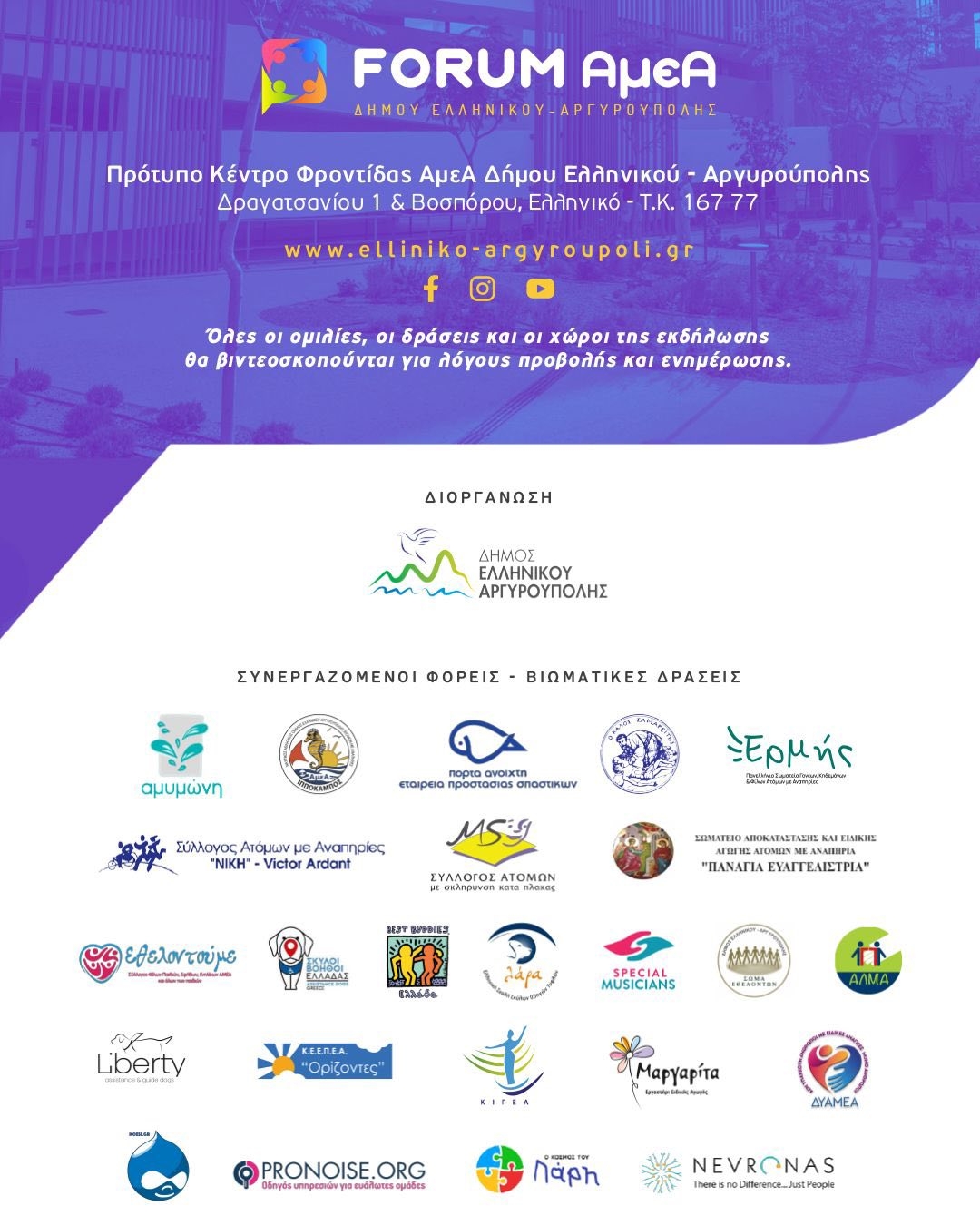 Η Τελετή Έναρξης του FORUM θα διεξαχθεί την Τετάρτη 1η Οκτωβρίου 2025 και ώρα 18:00 στο Πρότυπο Κέντρο Φροντίδας ΑμεΑ του Δήμου Ελληνικού Αργυρούπολης (Δραγατσανίου 1 & Βοσπόρου, Ελληνικό). Κατά τη διάρκεια της πρώτης ημέρας του FORUM, θα πραγματοποιηθεί και ξενάγηση του κοινού στις εγκαταστάσεις.