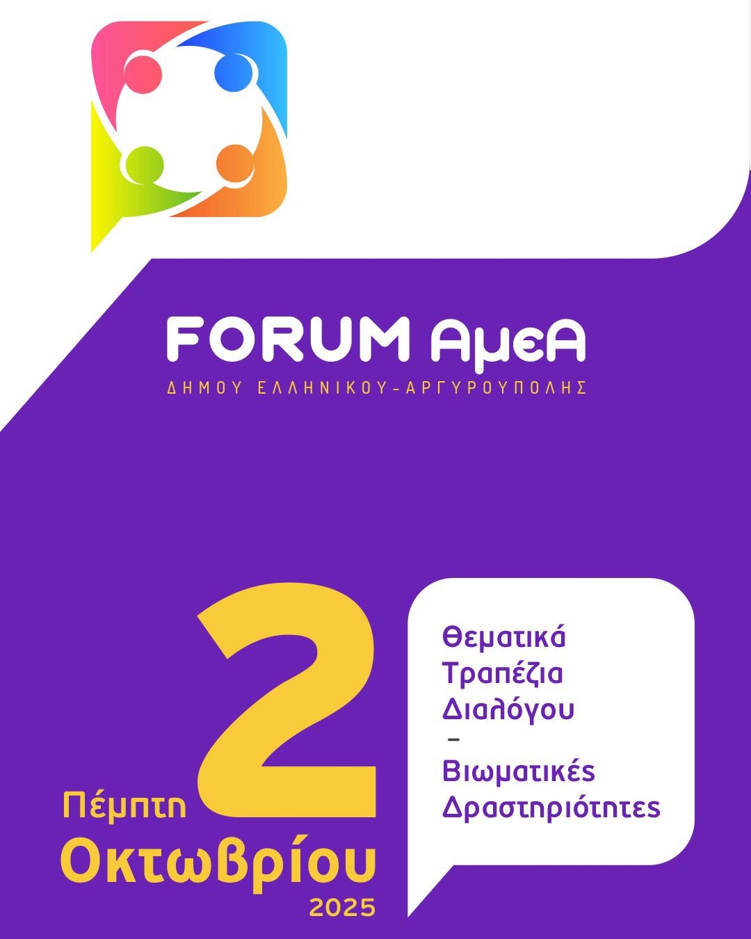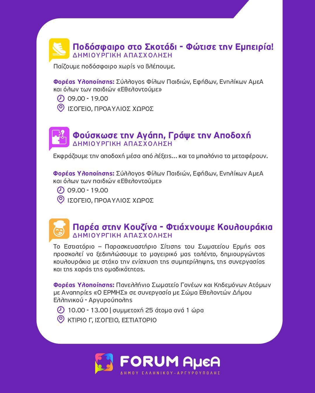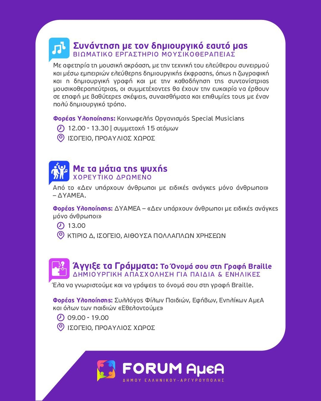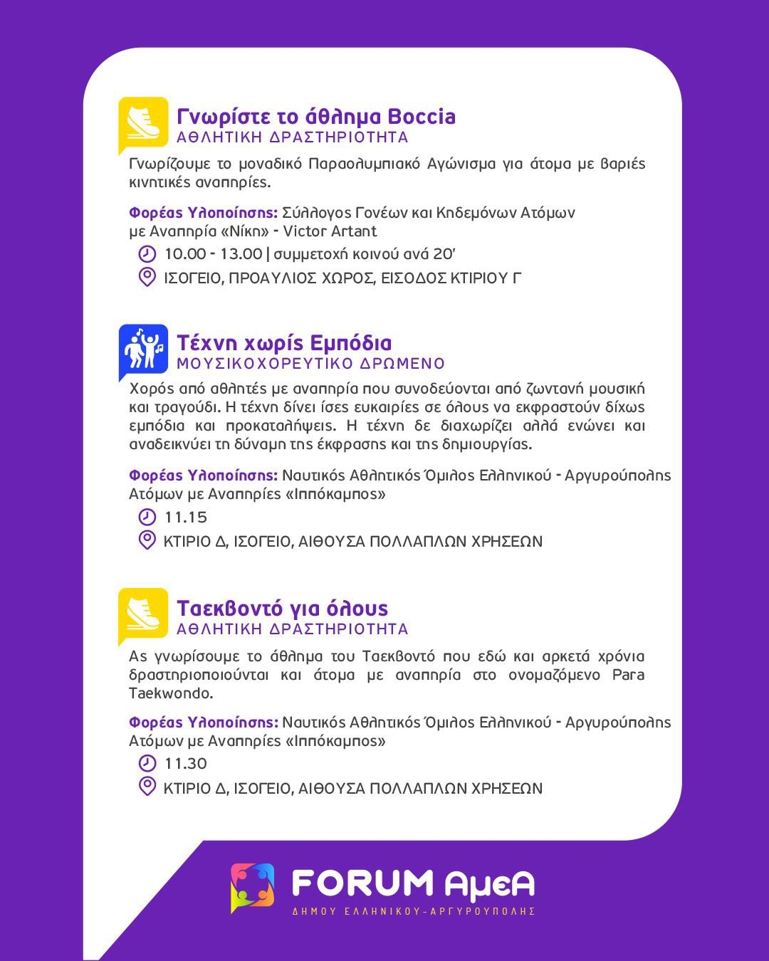 Η Τελετή Έναρξης του FORUM θα διεξαχθεί την Τετάρτη 1η Οκτωβρίου 2025 και ώρα 18:00 στο Πρότυπο Κέντρο Φροντίδας ΑμεΑ του Δήμου Ελληνικού Αργυρούπολης (Δραγατσανίου 1 & Βοσπόρου, Ελληνικό). Κατά τη διάρκεια της πρώτης ημέρας του FORUM, θα πραγματοποιηθεί και ξενάγηση του κοινού στις εγκαταστάσεις.