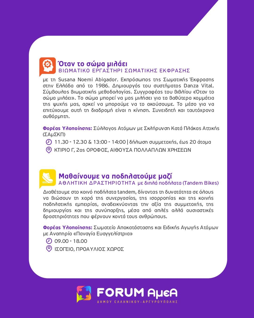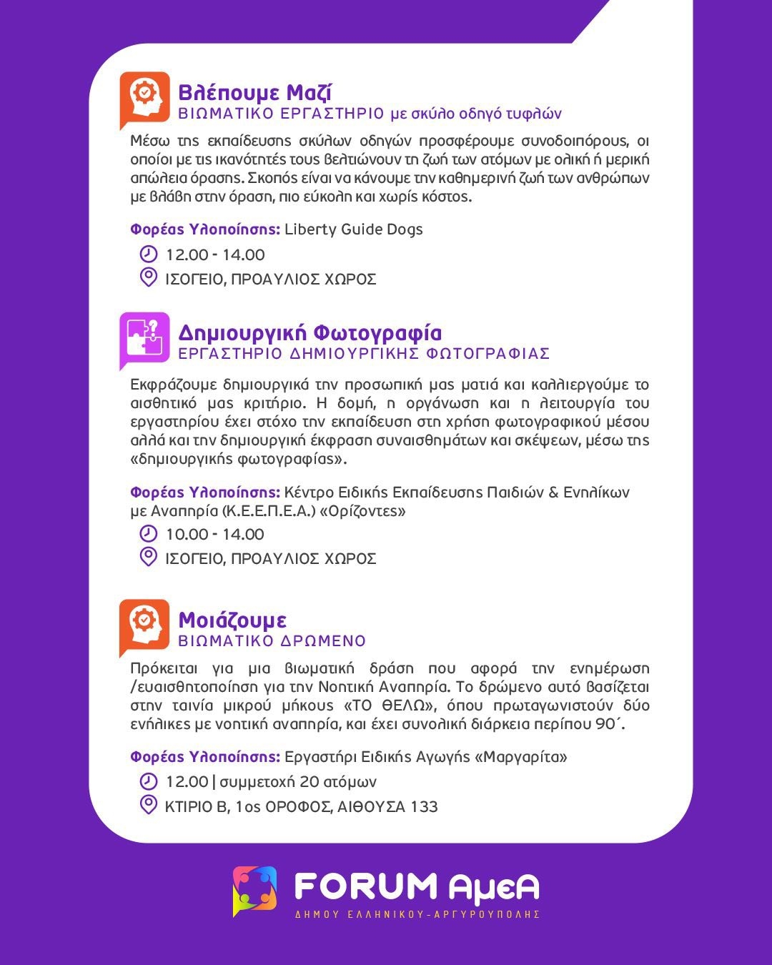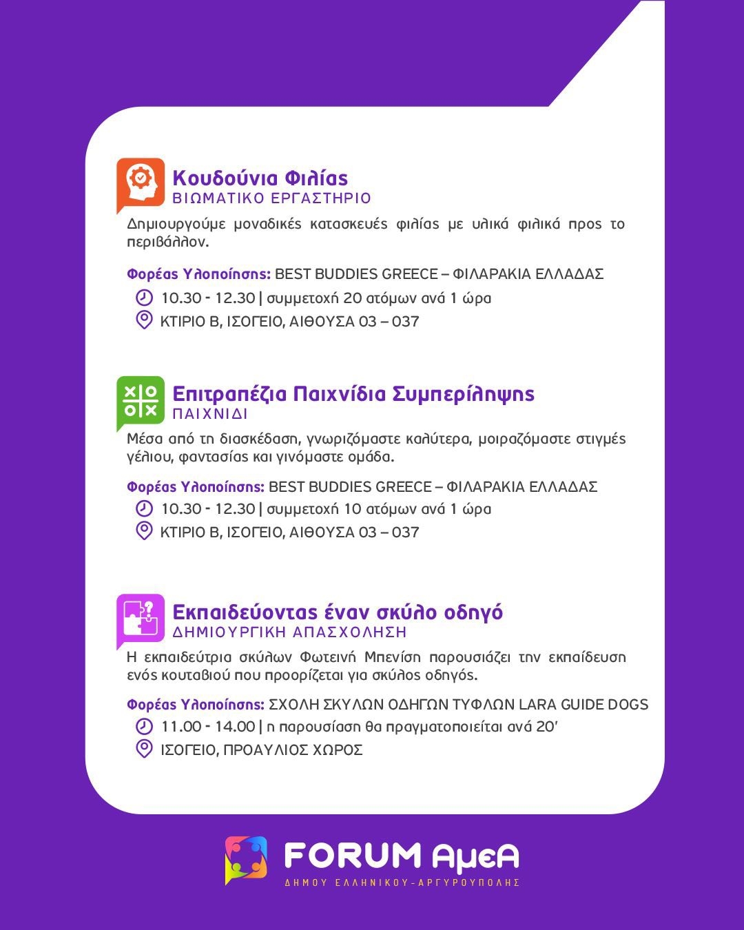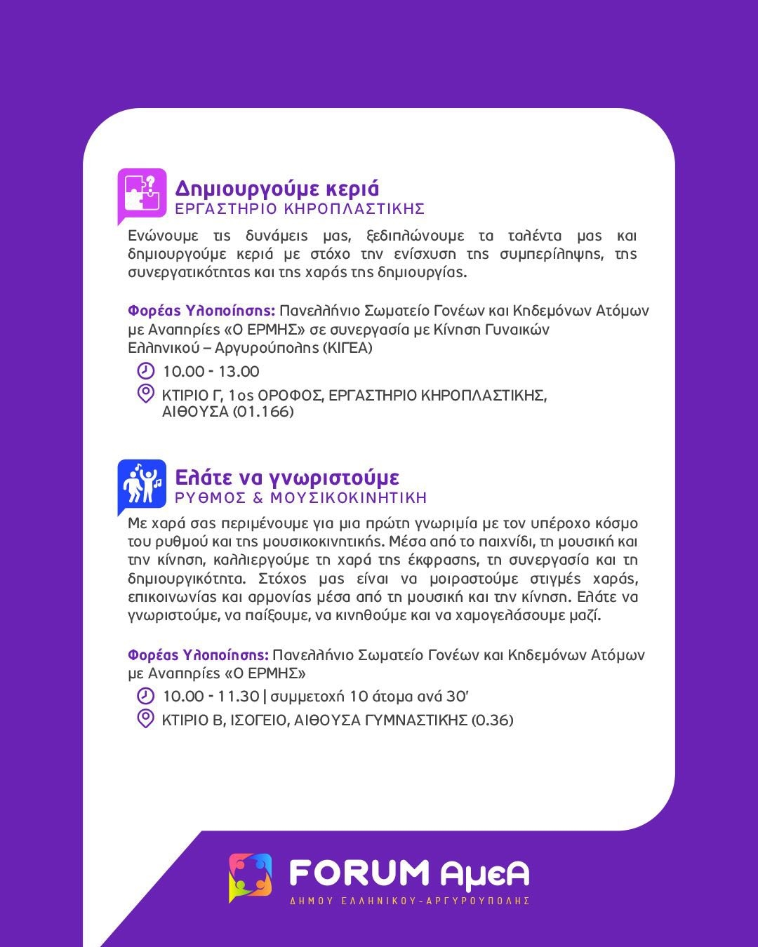 Η Τελετή Έναρξης του FORUM θα διεξαχθεί την Τετάρτη 1η Οκτωβρίου 2025 και ώρα 18:00 στο Πρότυπο Κέντρο Φροντίδας ΑμεΑ του Δήμου Ελληνικού Αργυρούπολης (Δραγατσανίου 1 & Βοσπόρου, Ελληνικό). Κατά τη διάρκεια της πρώτης ημέρας του FORUM, θα πραγματοποιηθεί και ξενάγηση του κοινού στις εγκαταστάσεις.