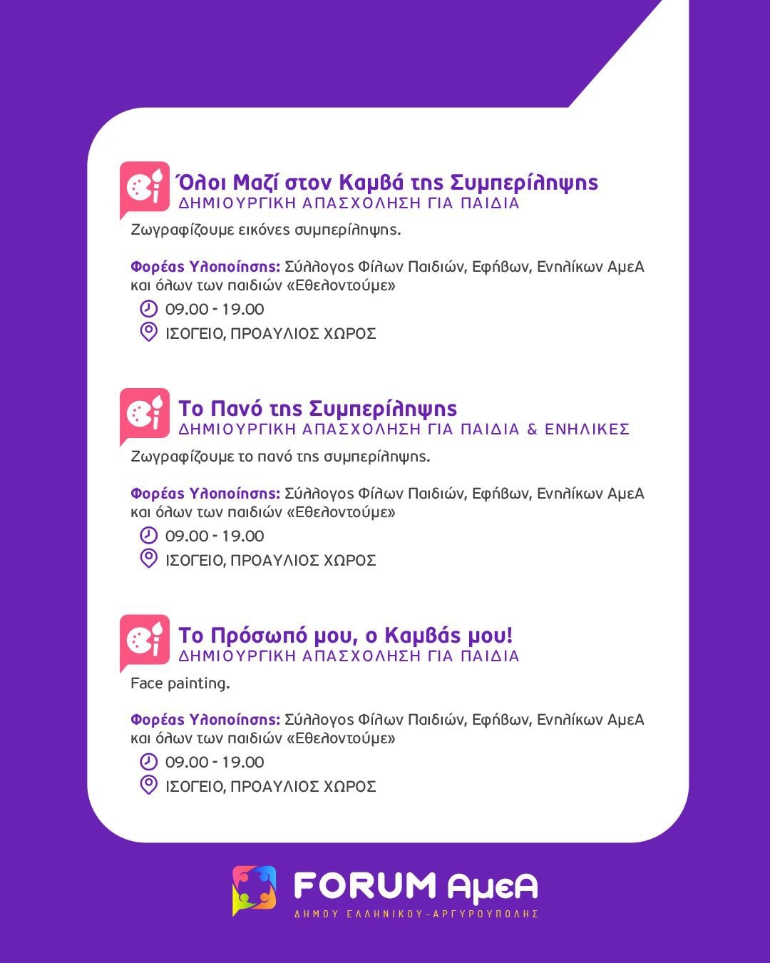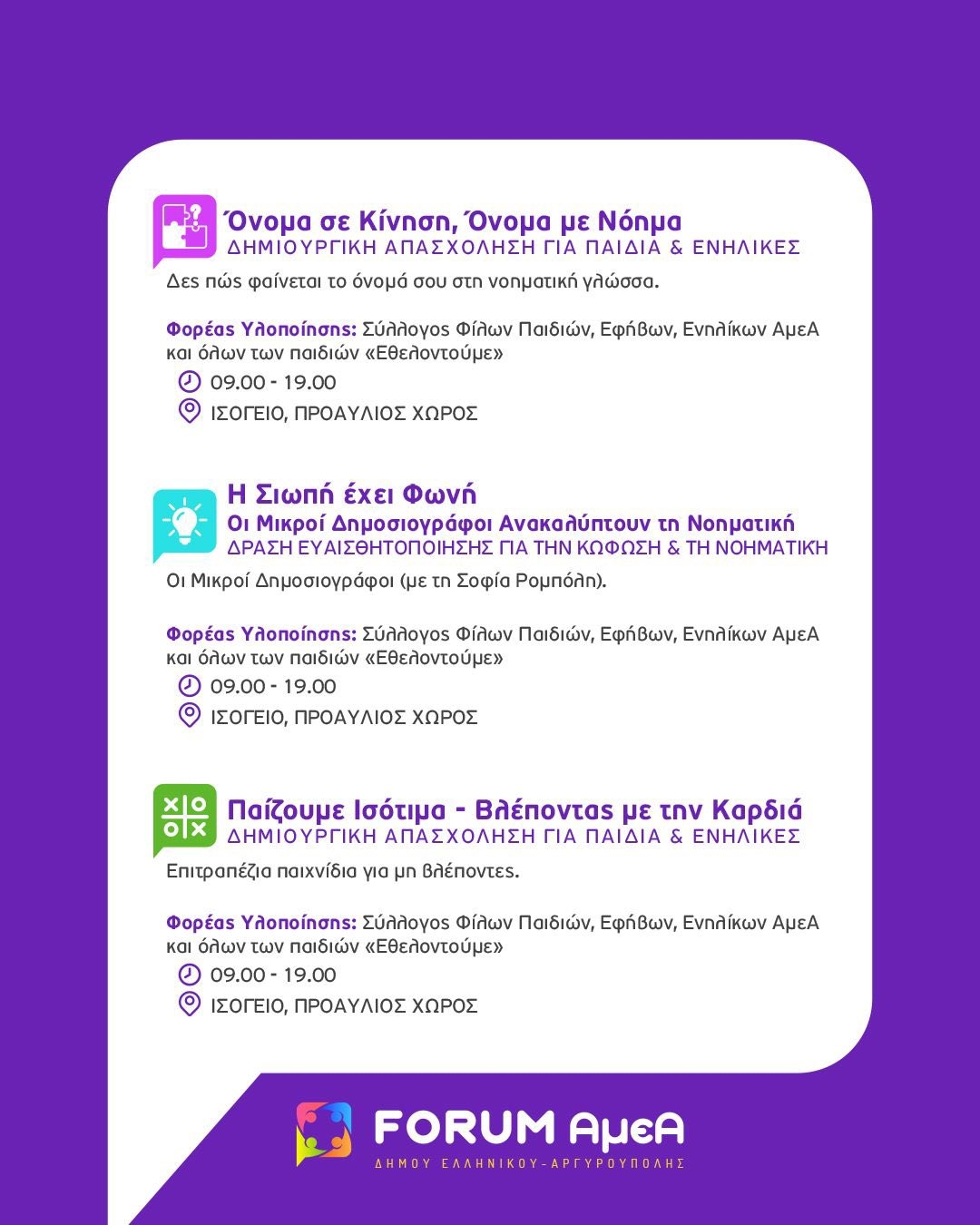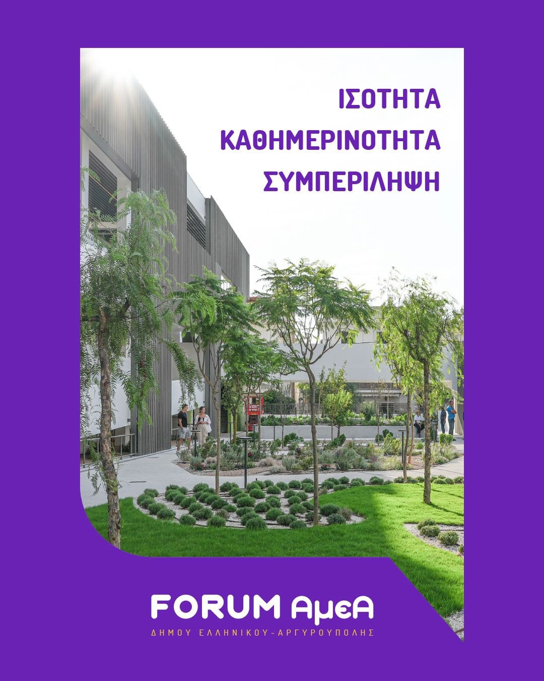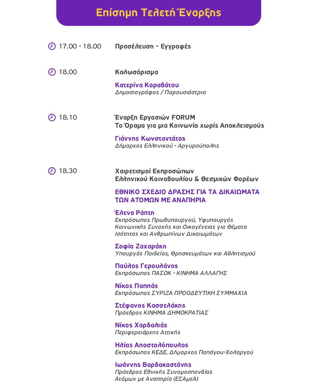 Η Τελετή Έναρξης του FORUM θα διεξαχθεί την Τετάρτη 1η Οκτωβρίου 2025 και ώρα 18:00 στο Πρότυπο Κέντρο Φροντίδας ΑμεΑ του Δήμου Ελληνικού Αργυρούπολης (Δραγατσανίου 1 & Βοσπόρου, Ελληνικό). Κατά τη διάρκεια της πρώτης ημέρας του FORUM, θα πραγματοποιηθεί και ξενάγηση του κοινού στις εγκαταστάσεις.