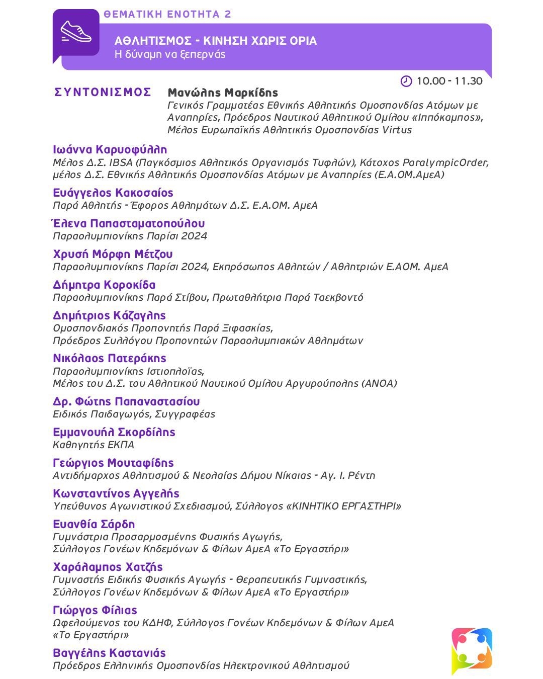 - Αθλητισμός – Κίνηση χωρίς όρια: Η δύναμη να ξεπερνάς. Συντονισμός: Μανώλης Μαρκίδης.