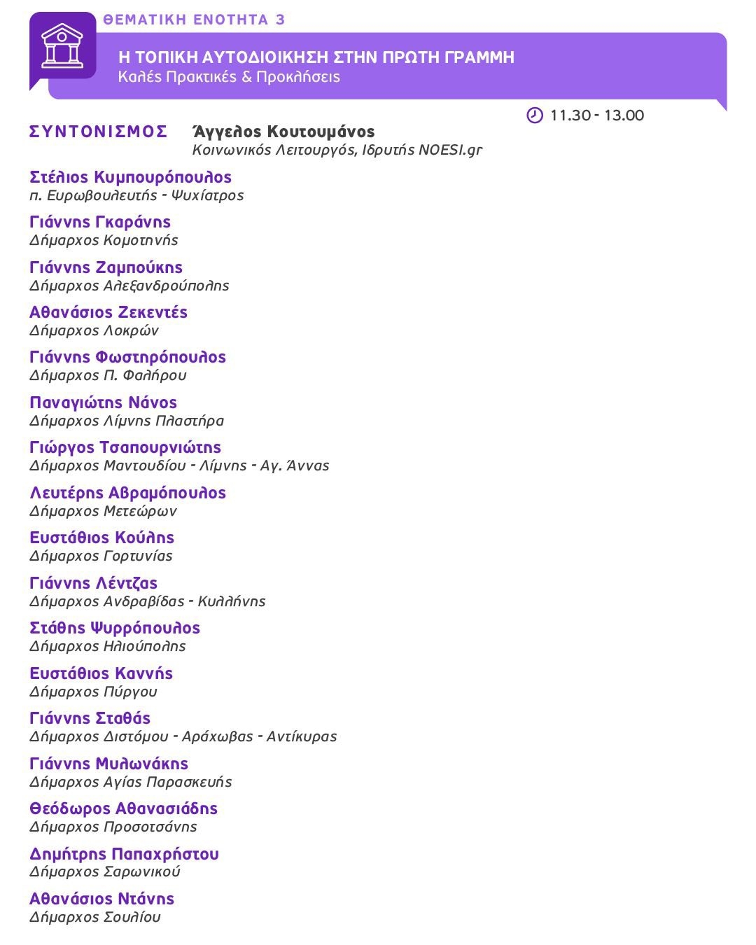 - Η Τοπική Αυτοδιοίκηση στην Πρώτη Γραμμή: Καλές Πρακτικές & Προκλήσεις. Συντονισμός: Άγγελος Κουτουµάνος.