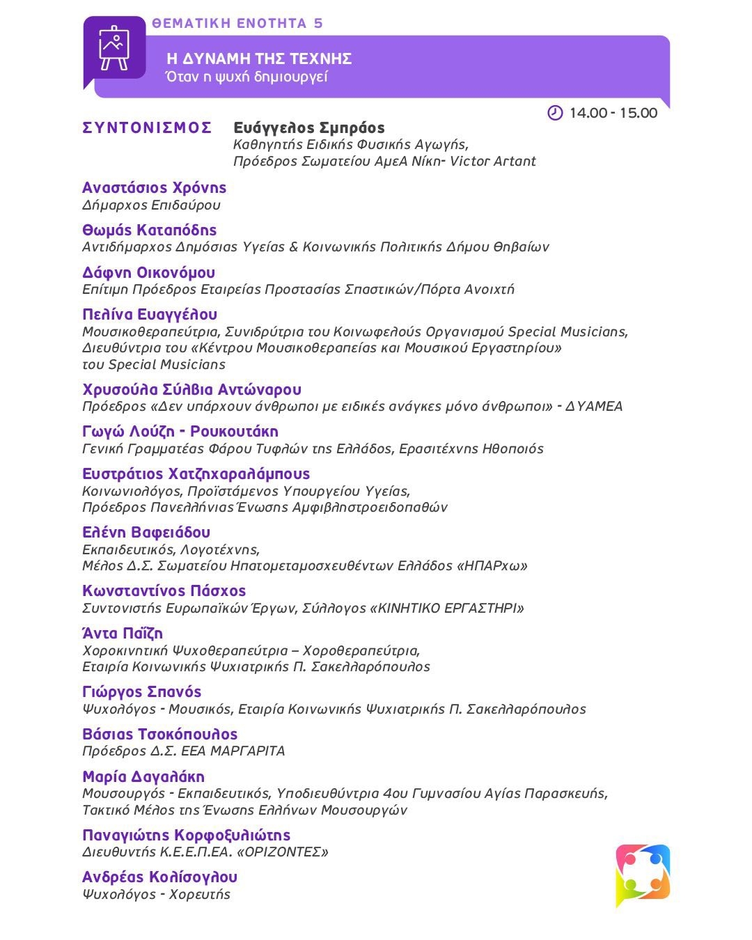 - Η Δύναμη της Τέχνης: Όταν η ψυχή δημιουργεί. Συντονισμός: Ευάγγελος Σµπράος.