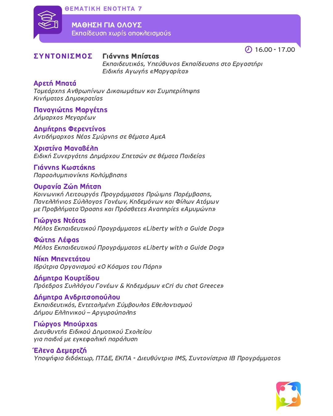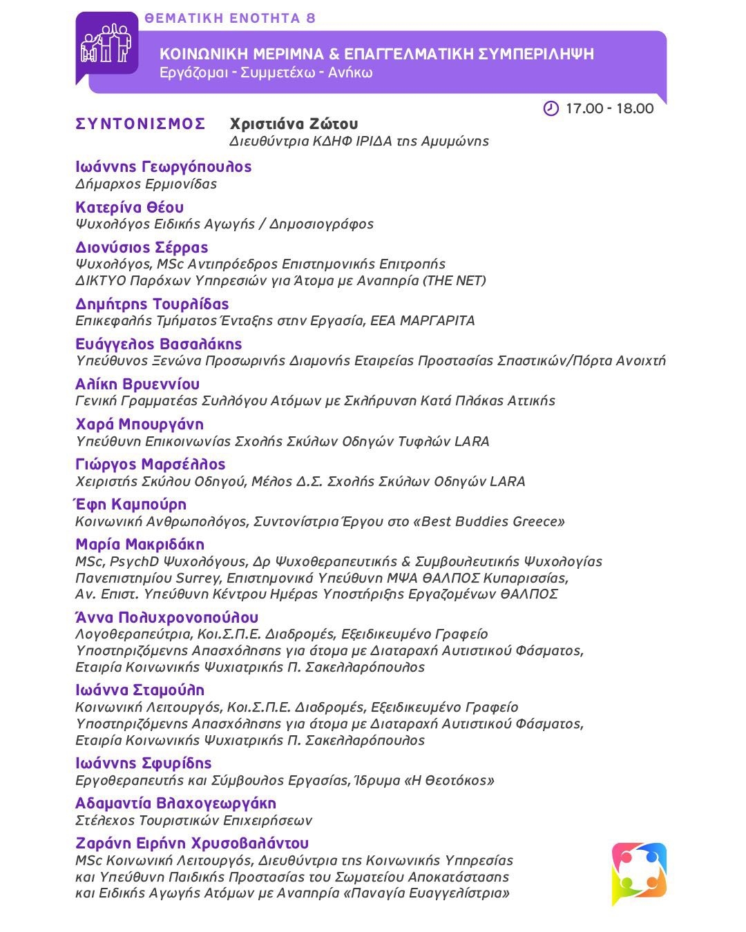 - Κοινωνική Μέριμνα & Επαγγελματική Συμπερίληψη: Εργάζομαι – Συμμετέχω – Ανήκω. Συντονισμός: Χριστιάνα Ζώτου.