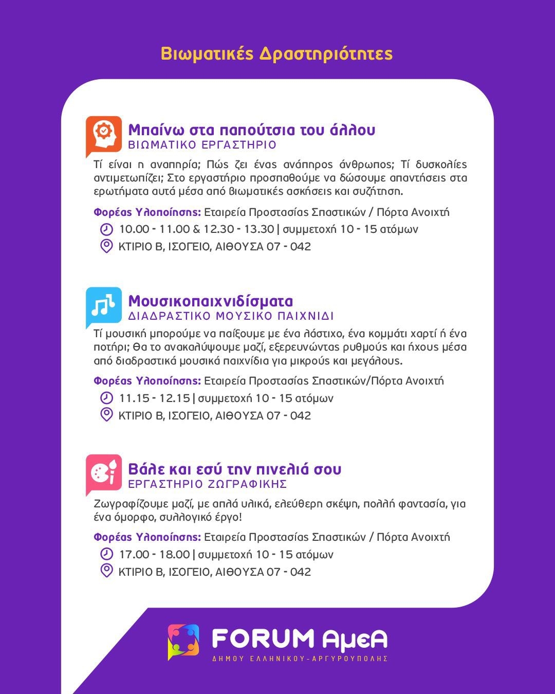 Παράλληλα, θα πραγματοποιηθούν στον ίδιο χώρο, 34 βιωματικές δράσεις που είναι ανοιχτές για το κοινό και για την μαθητική κοινότητα με στόχο την ενημέρωση, την ευαισθητοποίηση και την ενίσχυση της συνεργασίας μεταξύ όλων των εμπλεκόμενων φορέων θέτοντας στο επίκεντρο τα Άτομα με Αναπηρία ως αναπόσπαστο κομμάτι της κοινωνίας μας.